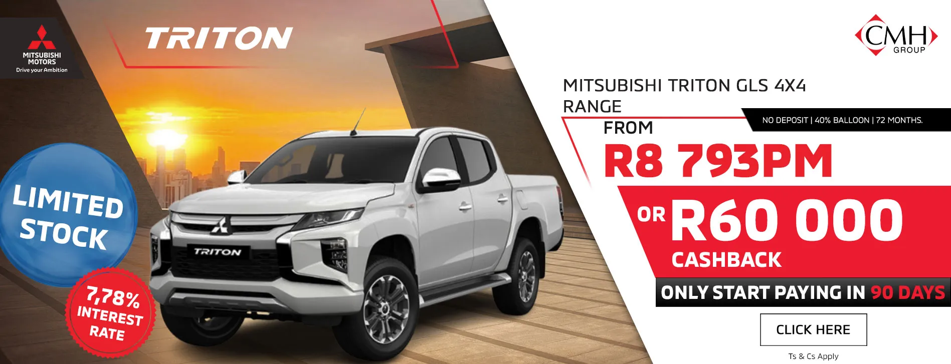 Home Dream Big. Drive bigger With our range of head turners ASX From R409 990 Take Me There Eclipse Cross From R524 990 Take Me There Next Gen Triton From R479 990 Take Me There Outlander From R709 995 Take Me There Outlander Sport From R429 990 Take Me There Pajero Sport From R789 990 Take Me There Triton From R474 995 Take Me There Xpander From R365 995 Take Me There Let your Mitsubishi find you Build What type of experience do you need? SUV Bakkies Crossover Selected : Seats How many seats do you need? Selected : Environment Where do you usually drive your car? Selected : ASX From R409 990 View Showroom Eclipse Cross From R524 990 View Showroom Next Gen Triton From R479 990 View Showroom Outlander From R709 995 View Showroom Outlander Sport From R429 990 View Showroom Pajero Sport From R789 990 View Showroom Triton From R474 995 View Showroom Xpander From R365 995 View Showroom Already a Mitsubishi Owner? Specials Pre-owned Book a Service